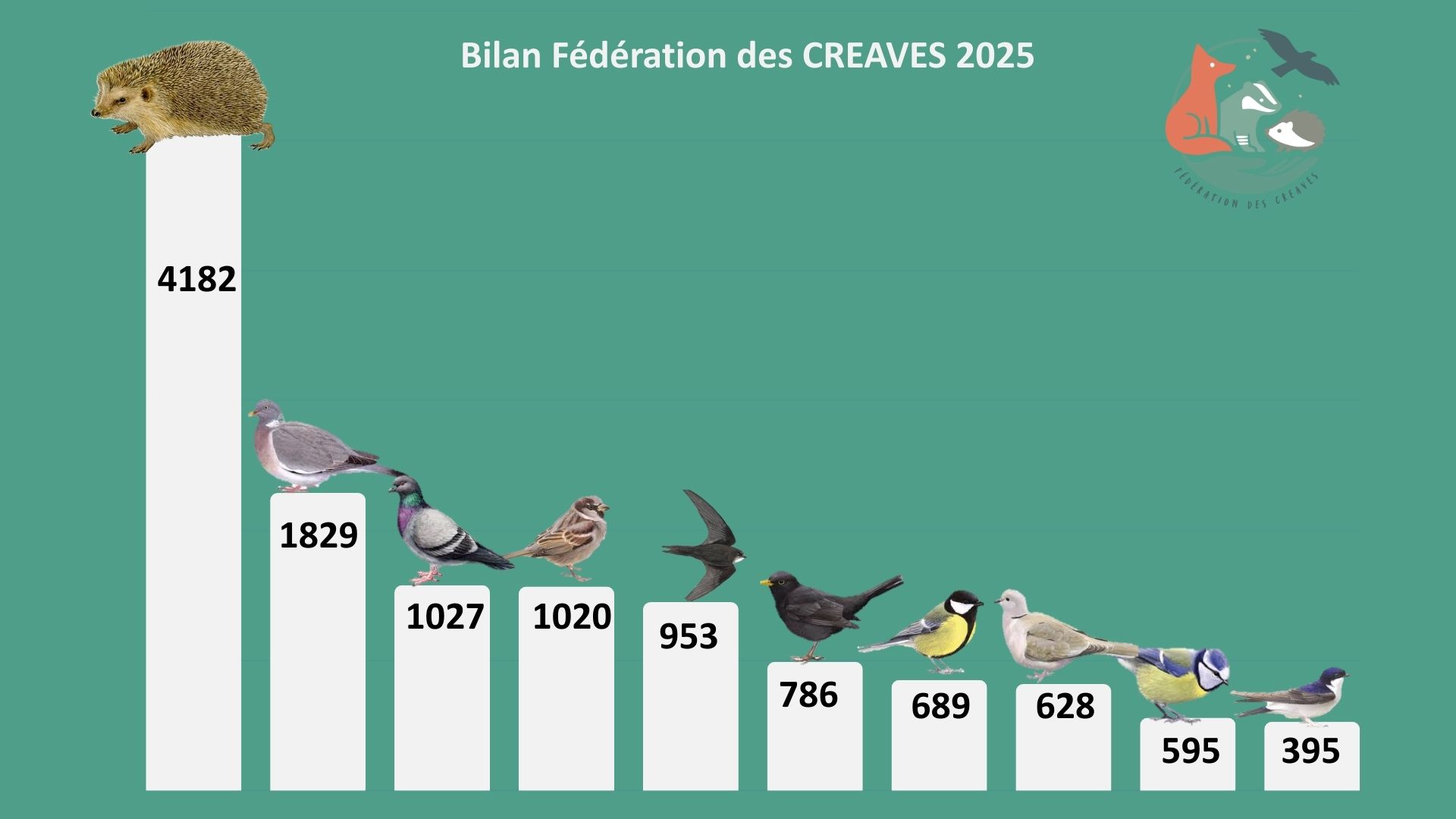 Les Hérissons représentent près d’un quart des animaux pris en charge, soit environ 23,6 % des accueils. Leur prise en charge est particulièrement exigeante : chaque réception mobilise en moyenne plus d’une heure de soins, incluant l’examen clinique, le déparasitage, les soins des plaies et l’installation adaptée. À l’échelle de l’année, cela représente déjà plus de 5 000 heures de travail consacrées uniquement aux premières prises en charge des hérissons, sans compter le suivi quotidien, l’alimentation, les traitements et les périodes de convalescence parfois longues. Ces soins sont coûteux et mobilisent fortement les équipes sur la durée.